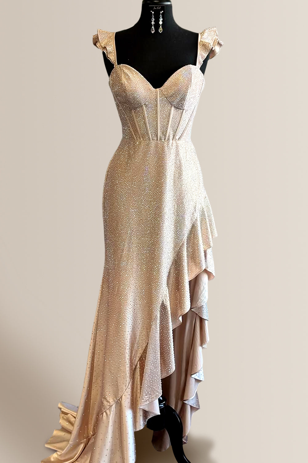 The champagne-colored fabric exudes a soft luster under the light, adding a touch of noble temperament to your ball look. The ruffled slit design at the hem not only adds to the dynamics of the dress, but also shows the leg lines looming while walking, adding a touch of mystery and temptation. Exquisite beaded decorations are dotted on various parts of the dress, like twinkling stars in the night sky, adding a touch of dazzling brilliance to the overall look.