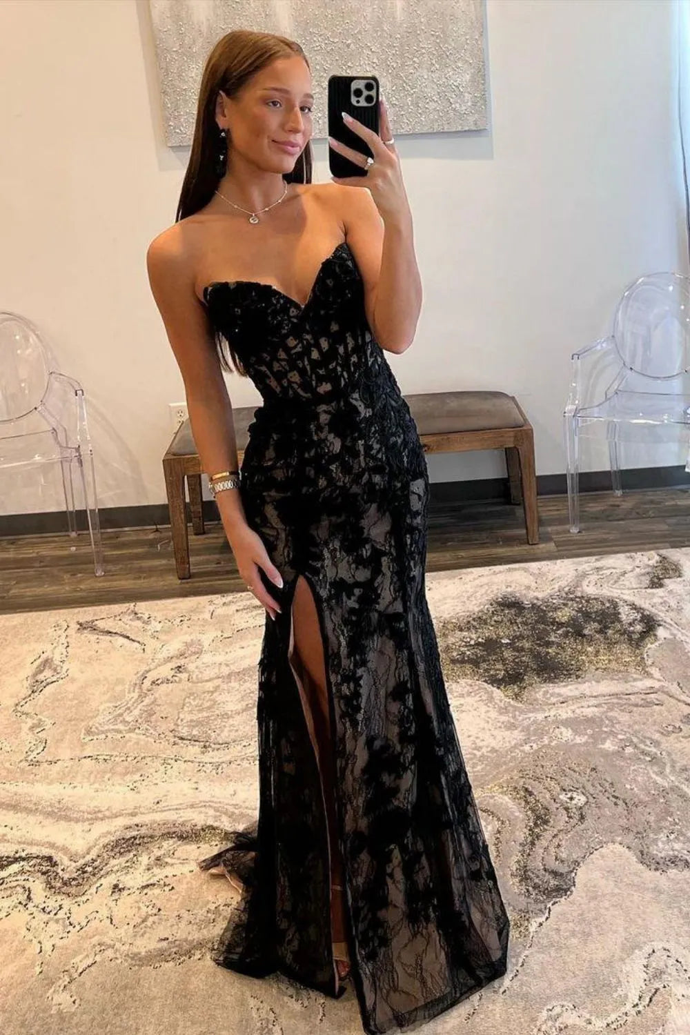 Made of high-grade black fabric, it shows an elegant and mysterious temperament. The off-the-shoulder design cleverly highlights the feminine soft lines while maintaining a moderate sexiness. The tight cut and mermaid-style skirt design fit the body curve perfectly, creating a smooth and elegant posture. The exquisite applique decoration on the dress adds a rich visual layering to the simple black tone, and the details are ingenious. The lace-up design is not only convenient to wear, but also adds a touch of casualness and personality to the overall shape. Wear it to show your nobility and charm.