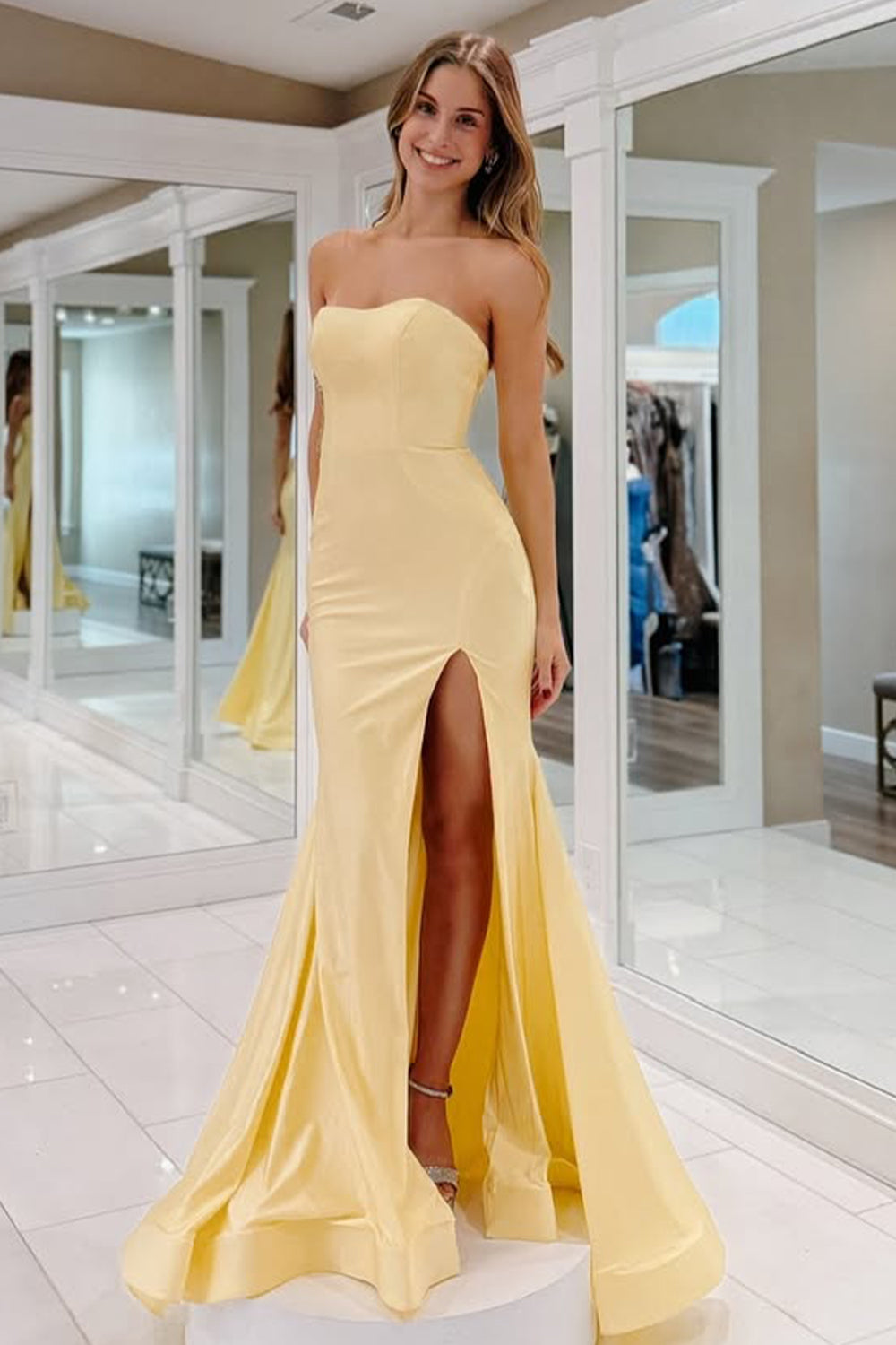 Radiate confidence and charm in this Chic Mermaid Yellow Strapless Long Satin Prom Party Dress with Slit. Featuring a sleek strapless neckline, this dress highlights your shoulders and creates a clean, elegant silhouette. The mermaid cut accentuates your curves and flares beautifully at the hem, while the bold front slit adds a touch of allure and ease of movement. Made from smooth, lustrous satin in a vibrant yellow hue, it catches the light with every step. Perfect for prom, formal events, or special celebrations, this dress combines modern sophistication with bold color, making you unforgettable.