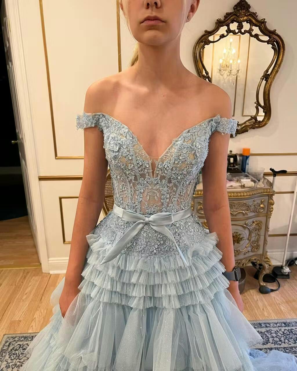 Made of delicate lace fabric, it shows elegance and femininity, and the off-the-shoulder design adds a touch of sexiness. The A-line cut cleverly modifies the body shape, making the wearer appear taller and slimmer. The multi-layered tulle skirt gently swings with the steps, creating a dreamy visual effect.