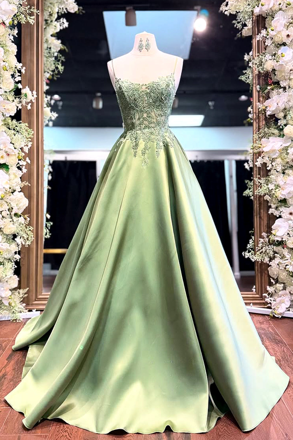 Feel like royalty in this Green A-Line Spaghetti Strap Princess Long Satin Ball Gown with Appliques. Designed to captivate, this gown features delicate spaghetti straps that provide a graceful and comfortable fit, beautifully complementing the A-line silhouette that flows effortlessly to the floor. The luxurious satin fabric drapes elegantly, giving the dress a regal and luminous finish. Intricate appliques embellish the bodice, adding a touch of romance and sophistication. The princess-style ball gown skirt creates a dramatic yet graceful effect, making you the star of any event. Perfect for prom, galas, or any special occasion, this dress blends timeless elegance with fairytale charm, ensuring you make an unforgettable entrance.