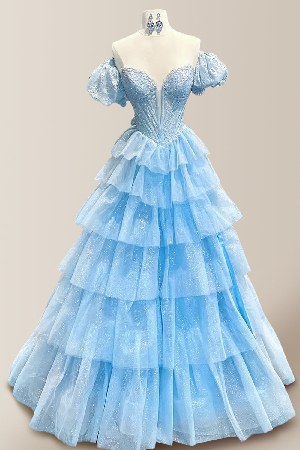 The light blue tone is like the clear sky in summer, giving people a sense of tranquility and freshness. The off-shoulder design cleverly shows the female clavicle line, adding a touch of sexiness and temptation. The multi-layered tulle skirt design creates a dreamy visual effect. Each layer of tulle glitters with a subtle luster, gently swaying with the dance steps, like starlight, dazzling.