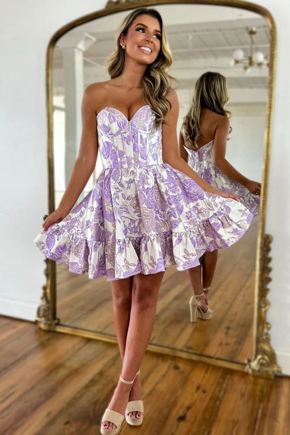 Step into timeless charm with this Lovely Sweetheart A-Line Short Floral Print Homecoming Party Dress. Featuring a romantic sweetheart neckline, this dress beautifully frames your neckline while adding a soft, feminine touch. The A-line silhouette cinches at the waist and flows into a flirty short skirt, creating a flattering and comfortable fit. Adorned with a vibrant floral print, it brings fresh, playful elegance perfect for homecoming, parties, or spring celebrations. Lightweight and effortlessly stylish, this dress blends sweet sophistication with youthful charm, making it a picture-perfect choice for your next special occasion.