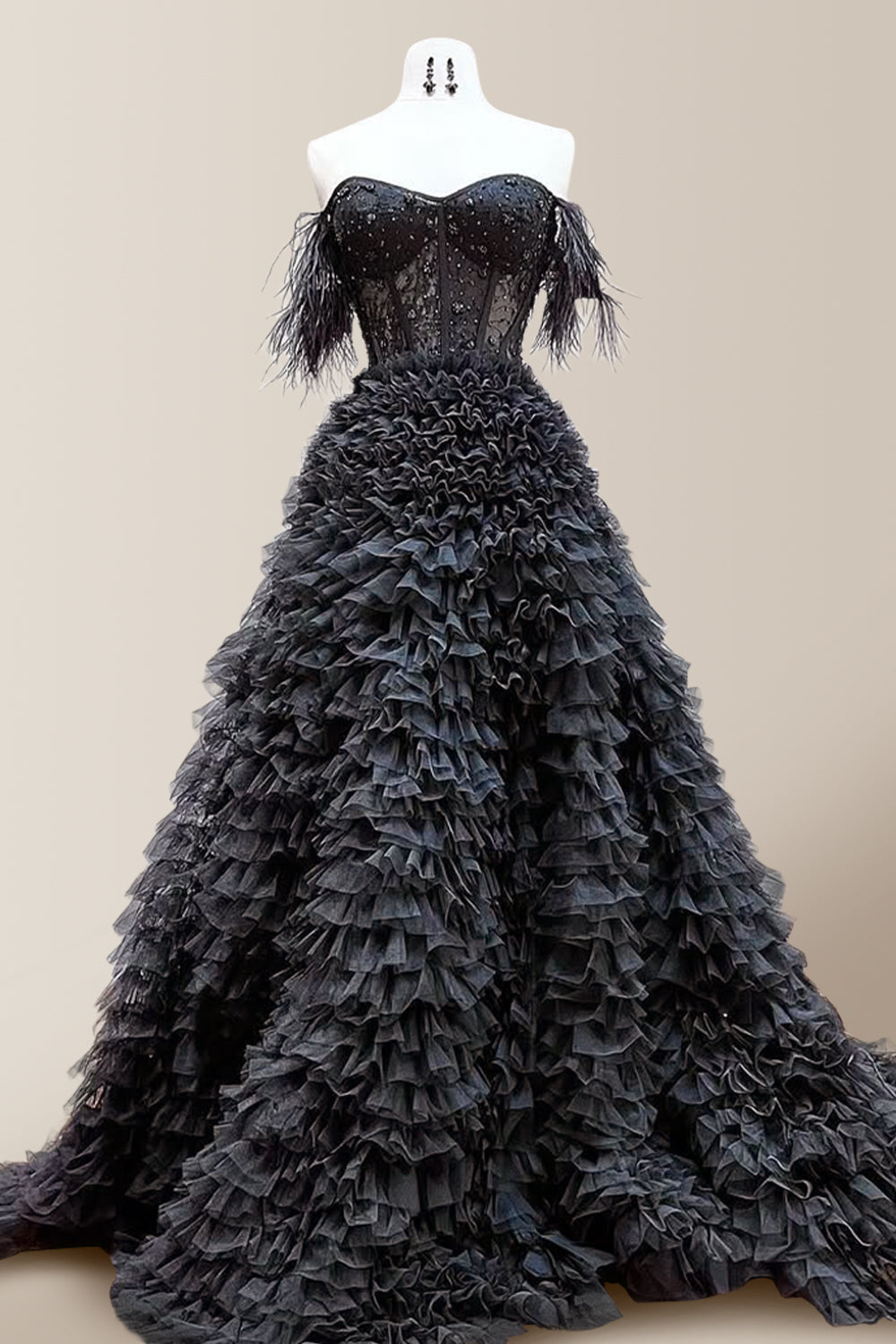 This dress perfectly interprets the essence of high-end fashion with its exquisite craftsmanship and elegant design. The A-shaped cut cleverly highlights the graceful figure of women while ensuring comfort. The off-shoulder design shows the femininity and sexiness of women, while the addition of pleated elements adds a rich sense of layering to the overall shape. The feather decoration on the shoulder adds a touch of agility and mystery to the dress