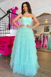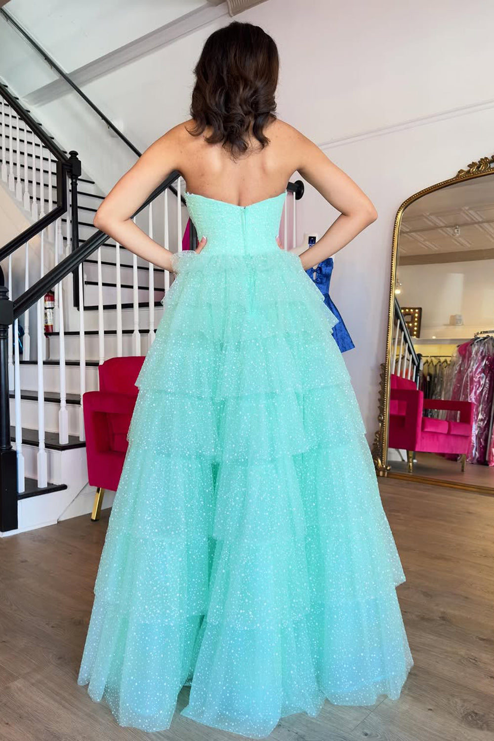 Make a dazzling entrance in this Mint Glamorous A-Line Strapless Long Glitter Tulle Prom Dress with Ruffled Skirt. The strapless neckline beautifully showcases your shoulders and adds a classic, feminine touch. Crafted from glittering tulle, the dress shimmers with every movement, capturing light from every angle for a radiant, show-stopping effect. The A-line silhouette is universally flattering, while the ruffled skirt adds volume and playful texture, creating a dramatic and elegant look. The soft mint color exudes fresh, modern charm, making it perfect for prom, pageants, or any special event. This dress blends glamour, romance, and sophistication, ensuring you shine with confidence and grace all night long.