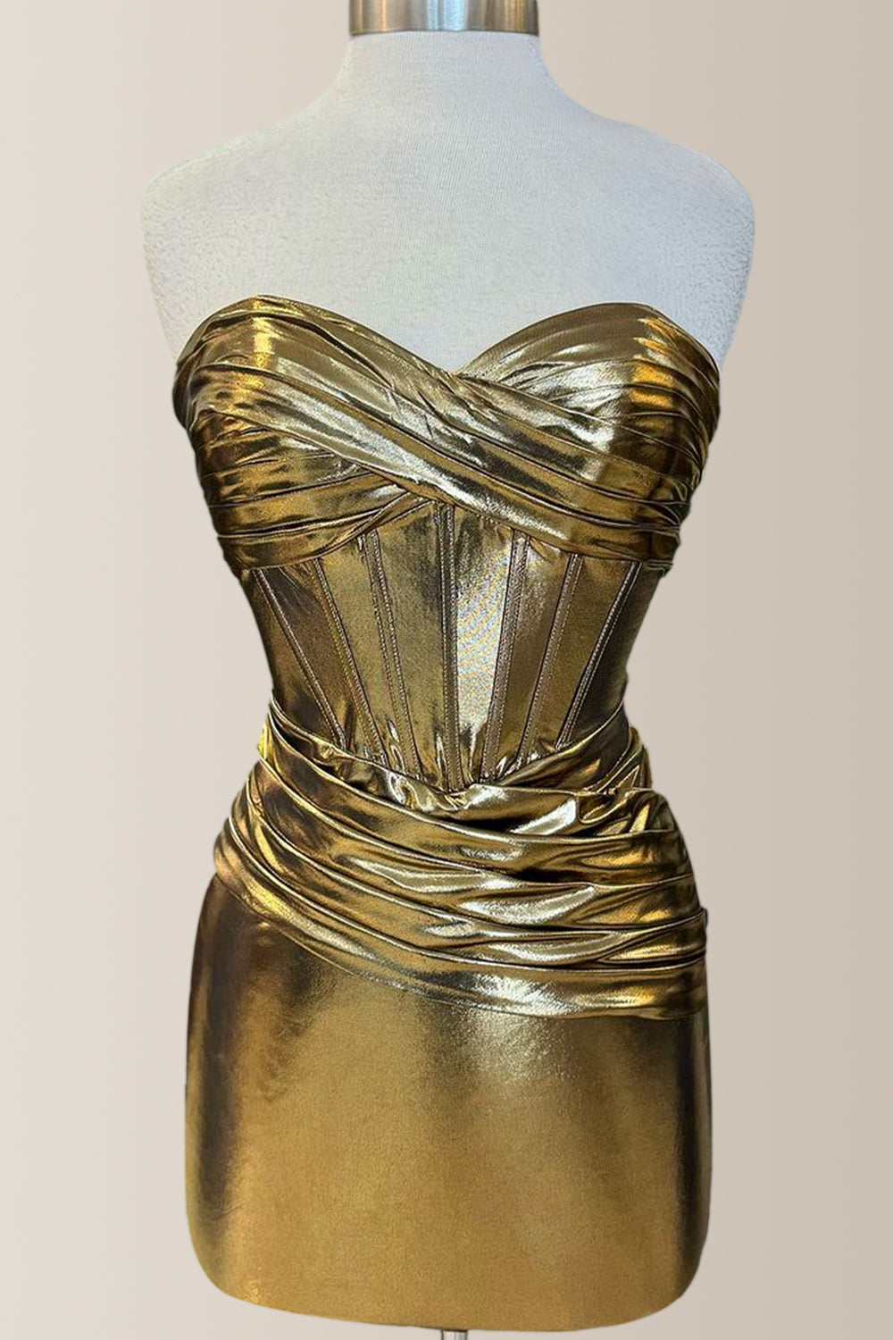 This short metallic gown fits perfectly to your body, showing off your elegant curves. The golden fabric sparkles under the light, like the brightest star in the night sky. The short design is not only fashionable, but also full of energy, allowing you to dance freely on the dance floor and enjoy yourself.