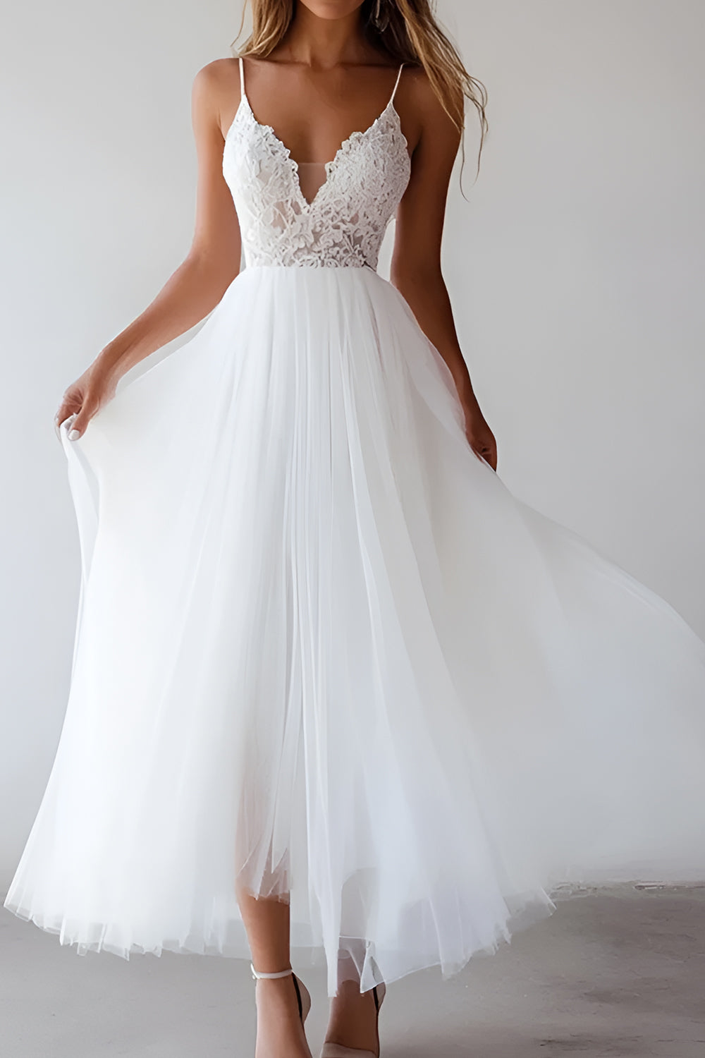Feel like royalty on your special day in this Princess A-Line Spaghetti Straps Lace Top Tea-Length Tulle White Graduation Dress. With its delicate spaghetti straps and intricately detailed lace bodice, this dress offers a romantic and feminine touch that perfectly complements its classic silhouette. The flattering A-line shape flows into a soft, tea-length tulle skirt, giving it a graceful, fairytale feel that's ideal for graduation, garden parties, or special celebrations. The crisp white hue adds a fresh and timeless elegance, while the light tulle layers provide beautiful movement with every step. Combining princess-inspired charm with modern simplicity, this dress is a picture-perfect choice for a memorable and magical graduation day.