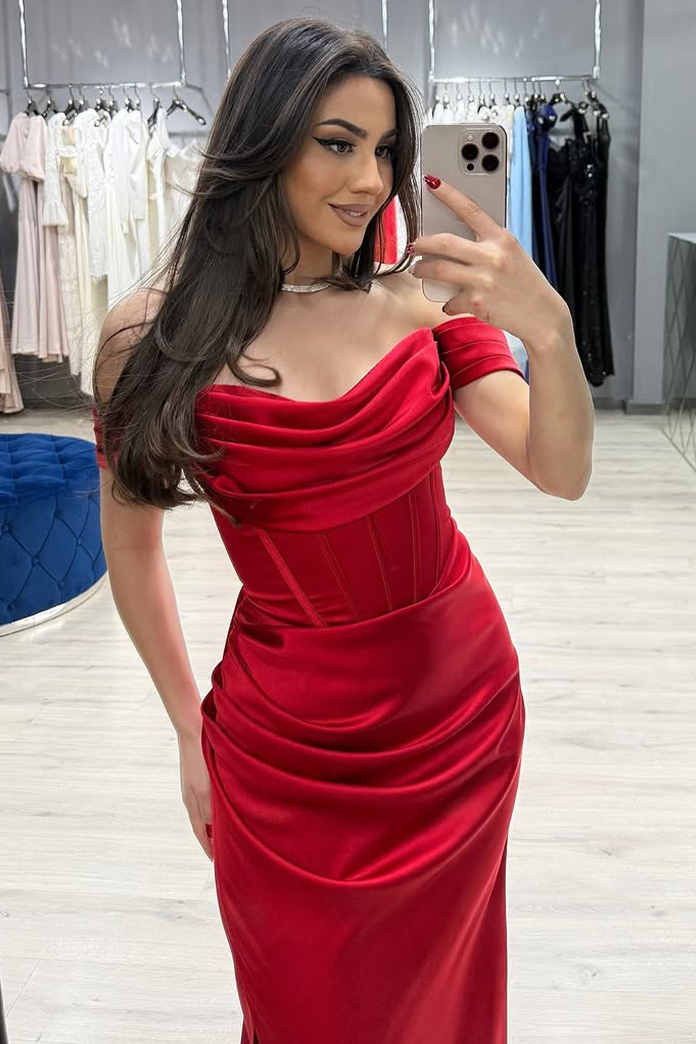 Make a bold and unforgettable entrance in this Red Off The Shoulder Mermaid Satin Prom Dress with Leg Slit. The off-the-shoulder neckline beautifully highlights your collarbones and shoulders, adding a touch of classic femininity and allure. The mermaid silhouette hugs your curves, creating a flattering and dramatic shape before flaring out at the bottom for an elegant, show-stopping effect. Made from luxurious satin, the fabric drapes smoothly, offering a glossy finish that adds to the dress's stunning appeal. The high leg slit brings a modern, sultry twist, allowing you to move with ease and confidence. The rich red color exudes passion, energy, and sophistication, making it perfect for prom, galas, or any special event. This dress combines bold elegance with timeless charm, ensuring you stand out and steal the spotlight.