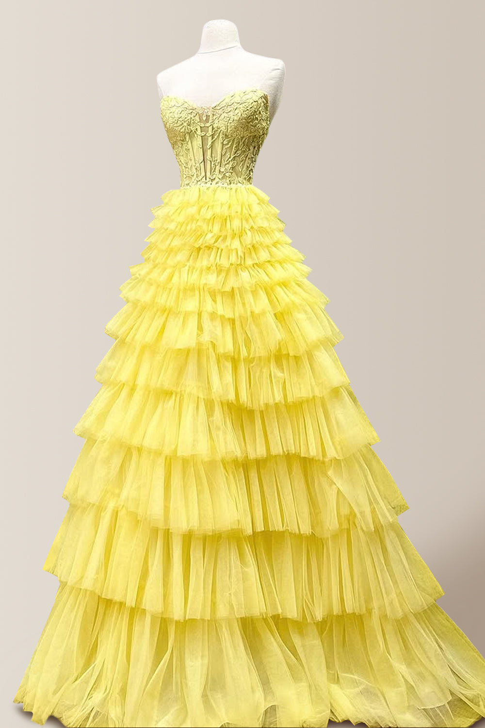 Made of premium lace material, the delicate pattern is looming on the skin, showing the feminine beauty and sexiness of women. The strapless design cleverly highlights the clavicle line, adding a touch of playfulness and temptation. The long design with layered tulle creates a dreamy layered feeling, gently swaying with the steps, like a dancing elf. The choice of yellow is bright and vibrant, injecting the warmth and vitality of the sun into the overall look.